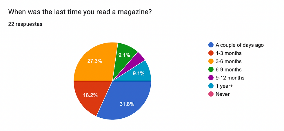 Also, about 36% stated that their main source of reading magazines is through the web. Producing an online magazine is much cheaper than producing a hard copy magazine because it cuts production costs such as printing, distribution and circulation costs. It also saves costs because there will not be copies that go unsold. An online publication platform gives you the an easier way to monitor how many people have read or downloaded the magazine. Apart from that, a large portion said that they usually read magazines in the past couple of days with 31%. These two questions can correlate since online versions of the magazine can make it easier to find better, more affordable copies of magazines in the real world, increasing the amount of readers. The quantitative amounts here were that a large number wanted the magazine to be in an online version, with about 36% and most people read magazines every day, over 30% of the surveyed.